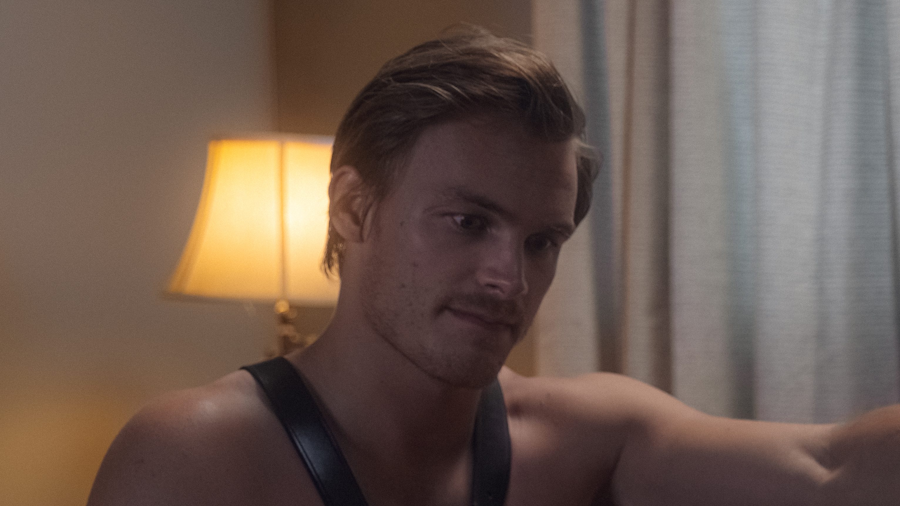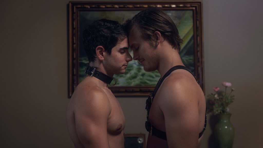 The dominant leather top. Or at least, that’s the plan. His inexperience makes him a hilariously inadequate bondage master, but he tries his best to make their fantasy work.